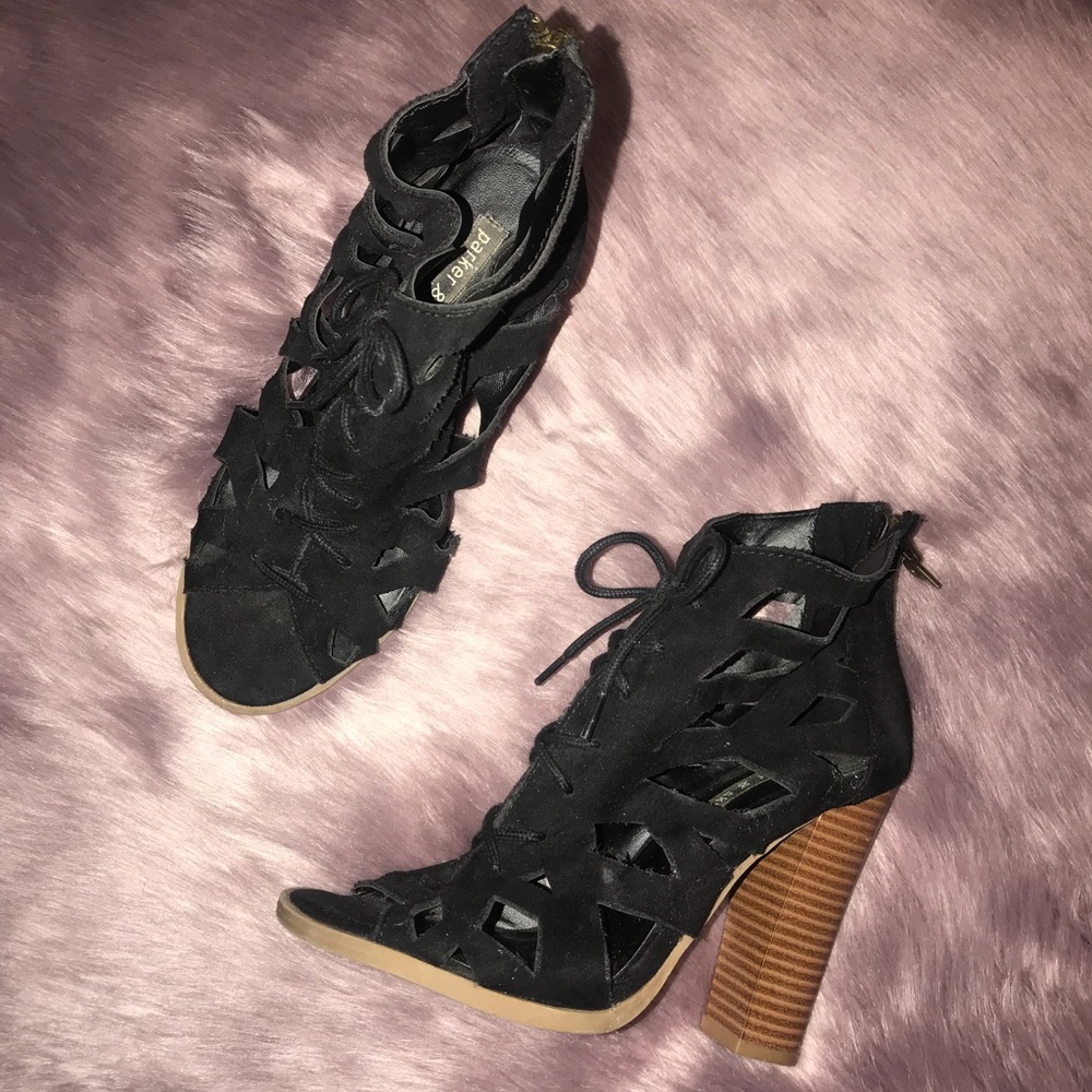 Black suede type material a little dusty from keeping in storage can be easily brushed off really good condition worn twice! Super pretty on! True to size!
