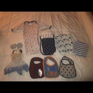 - 5 burb clothes, 2 receiving blankets, 3 bibs, 1 pair of mittens, 1 open end sleeper