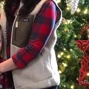 Patagonia cream and olive Sherpa vest, retail is $149 plus tax. It’s in great condition and was worn only a few times. It’s very warm and has an insulated lining to keep the cold out. I LOVE this vest, even more than my Los Gatos and even better sweater Patagonia vests! I always got tons of compliments when I wore it, it’s super cute paired with a pair of green or navy hunter boots, i lost weight & now it’s too big :( it’s a size medium but runs a little big so it’ll fit a M to a size L.