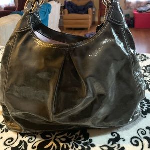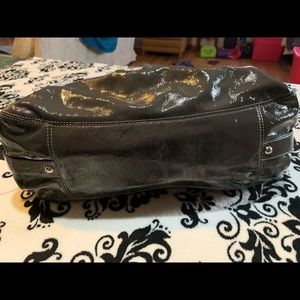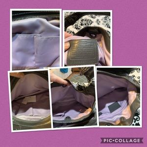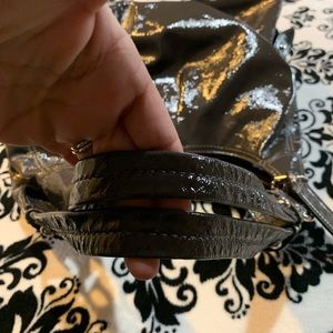 Very good used condition. Only mark is on inside as shown in pics. Shiny gray with light purple lining. 3 compartments.