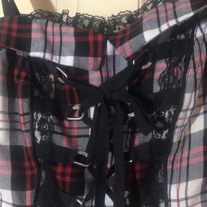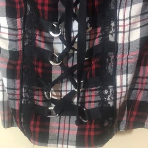 It's been worn many times but it has gotten too small for me, unfortunately. The tear is inside the corset and does not show at all when wearing it.