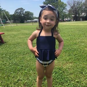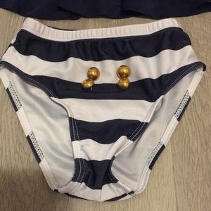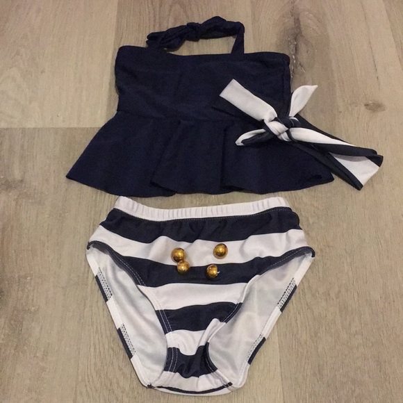Adorable blur & white sailor inspired swimsuit. EUC only worn a couple times. Includes bottoms, halter top and matching headband