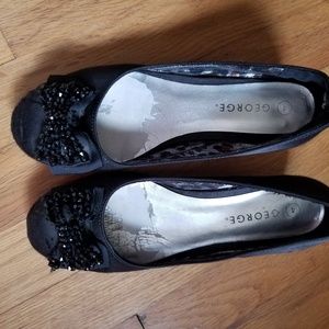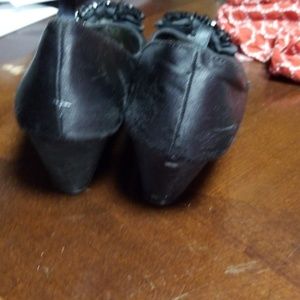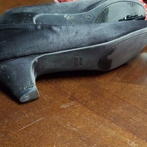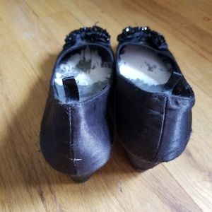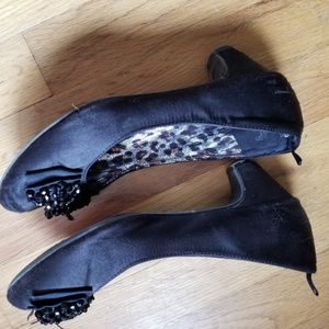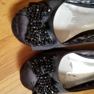 Cute dress shoes. Satin look with black beaded bows. Little 1 inch heel. A few lite scuffs on the heels but tons of life left, and super cute!
