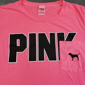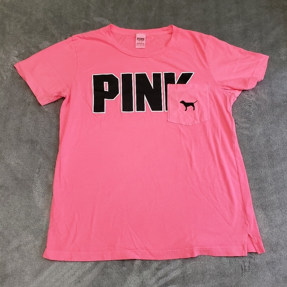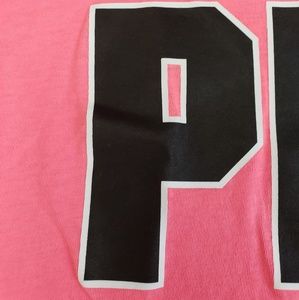 Size large vs Pink tee. Good condition. No holes or stains and lettering is great, no cracks or fading.