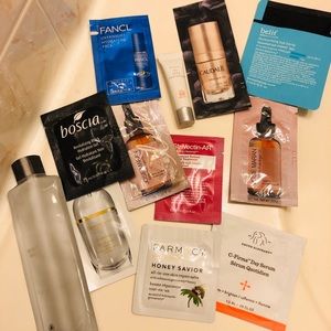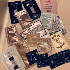 The travel size combo includes brands: Chanel mascara and primer, cdp radiant cream foundation, lunasol, Albion, tarte, smashbox, makeup forever, hourglass, drunk elephant, Jill Stuart, belif, Elizabeth Arden, etc