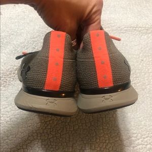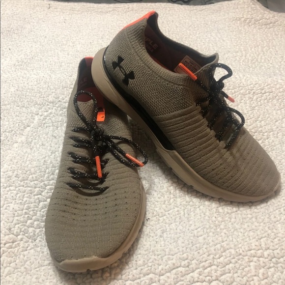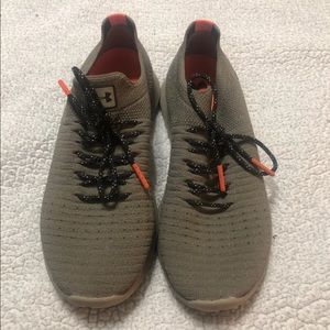 Army green with orange and black shoelaces Under Armour Tennis!!! Size 7 in women’s and in almost new condition... smoke free home just cleaning out closet!!!