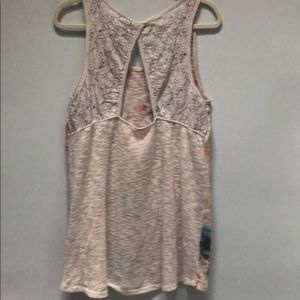Hey y’all! This Torrid Floral tank is super cute! It is off-white/ivory and beige light sweater material and covered in pink, blue, peach and coral flowers. The back is a heathered beige with lace and a triangular cutout.