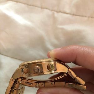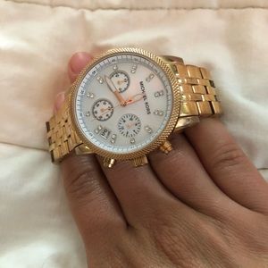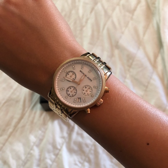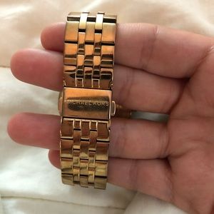 @ssatcher it’s all gold tone, it’s authentic MK but I’m not sure if it’s real gold or not. I just posted more pics and the face size is about 1 1/2 - 2 inches