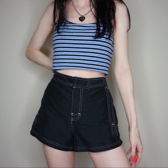 Emo Kid Board Shorts ⛓ Y2K sporty black shorts with contrast white stitching and chunky zippers! Velcro up the front and across the waist and has functional front zipper pockets! Perf pre loved vintage condition. PINNED ON ME! I am 5’7. Pair with a 90’s baby t and braids!