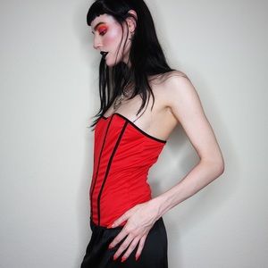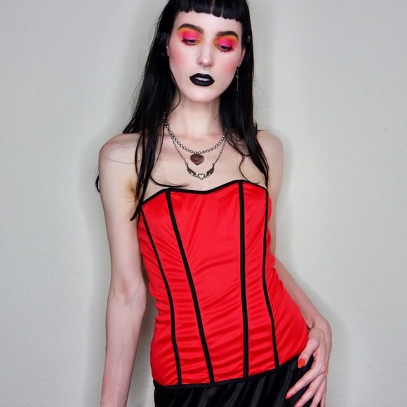 She Devil Bustier ❤️🖤 Cherry red and gothic black REVERSIBLE corset style bustier with flexible boning and a zipper back for EZ access. Has a lil stretch and hoops on the inside to attach straps if u want! Doesn’t include them. Would be cool to hook metal chain straps on them tho!!No size/brand listed but fits like a small. Absolutely gutted this is too big 4 me 😭 waist 26-28” Pair with Tripp pants and platforms for a 100% SINNER look‼️