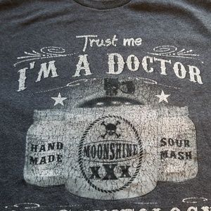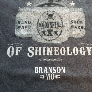 Dark gray with white . Vintage. moonshine, sour mash, shineology Branson MO t shirt