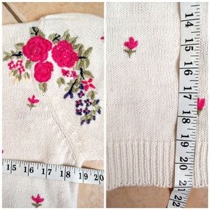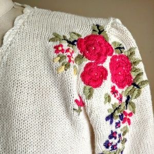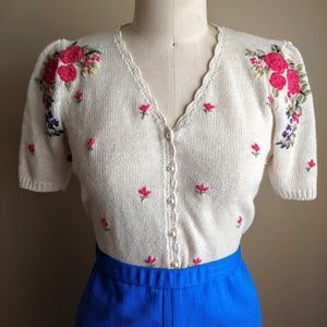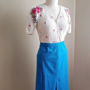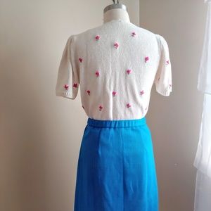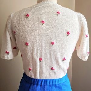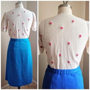 Does it get any cuter than this knitted puffed sleeve embroidered top!? I don't think it does! Total 1940s vibes! Super cute pink flowers grace this adorable button down sweater! Great condition! Best fit for a medium possibly a large. (Please see measurements in pics) skirt also available in my closet.