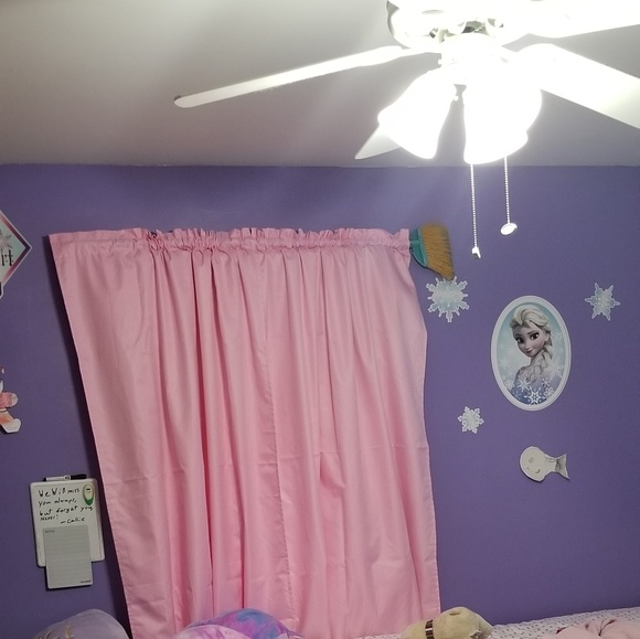 Light pink room darkening curtains. Selling as a set of two panels for one window. (Two windows worth available) Dimensions are approximately 41 inches wide by 62 inches long for one panel. These are used. My daughter is starting her teen years and wanted curtain that let light in her room. As a mom I was hoping her new curtain choice would keep her from sleeping in, but I was wrong.