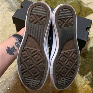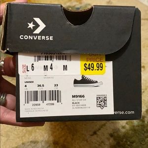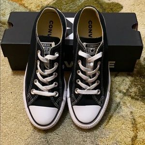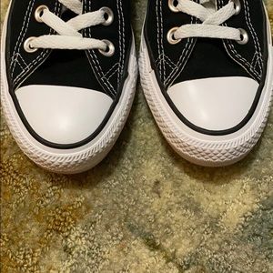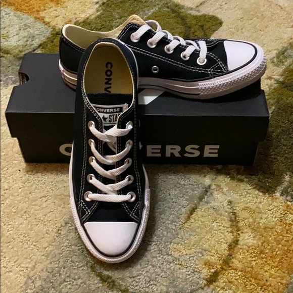 Black converse with white shoelaces brand new condition only wore twice and still in box... women’s size 6.... no rips.. stains or tears... just sitting in closet!!