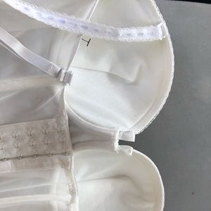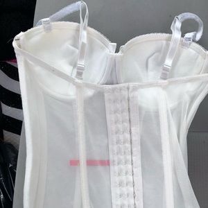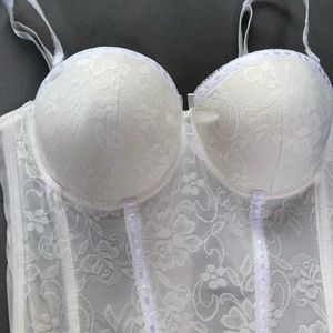 White Lacey corset/lingerie. Never worn. Brand new, perfect condition, but I removed the tags. Bought for Halloween and never wore. Size XL, runs a little small. Tight around the stomach. Bra size would range between 34C-36D. It was a LITTLE big on me and I am a 32C. However I needed the XL for the stomach area and it ended up working with a sticky bra underneath. It is already padded and has underwire. It’s push-up. Adjustable straps and adjustable back clips (3 settings). Original price: $55