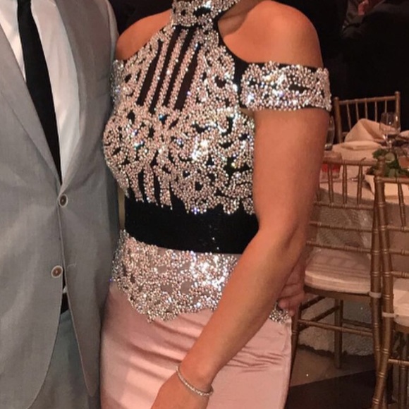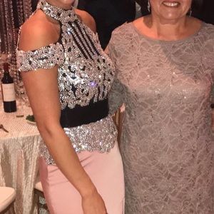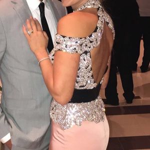 Beautiful rose gown with delicate embroidered bedding and open back details. This gown is meant to wow and turn heads. You will sparkle and catch everyone’s eye with a beautiful slit in front for easy movement. Was worn once for 4 hours max and is in mint condition. Was NOT dry cleaned bc it’s so delicate and heavy I was a little scared frankly. Light sign of wear at bottom of train due to dancing. Size 2-3 32C bust waist 36-27 and 5”7 tall not hemmed, I wore 4 inch heels so it’s plenty long.