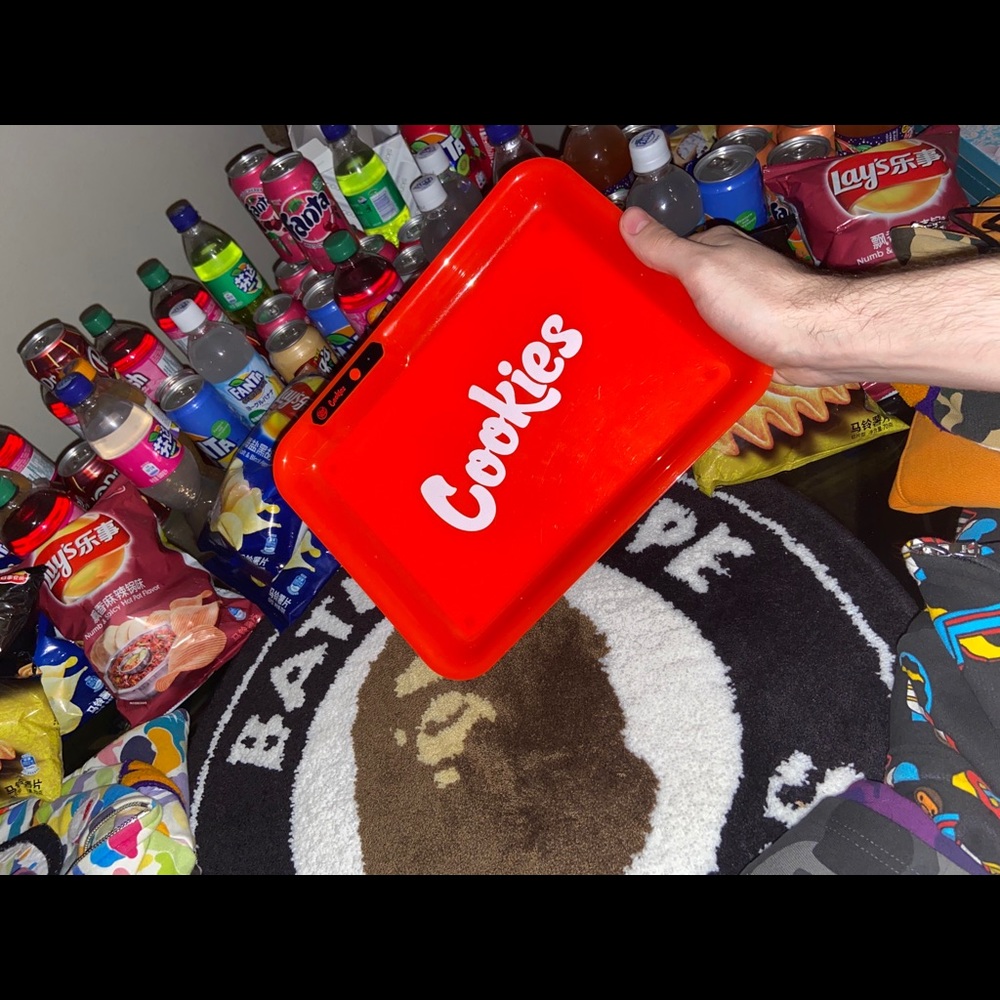 Glow Tray X Cookies SF Red In Hand Rechargeable 6 Glow Hours Usb Included. Condition is Used. But it is still a rolling tray in great great condition for being such, fully functional, turns on/off with 2 rapid clicks, After being turned on, changes colors 1 click at a time. Finally by holding the power button for 3 seconds the tray will cycle through the available colors. Great addition to anyone’s collections and will put a smile on any buyers face, or gift receiver for the upcoming holidays!
