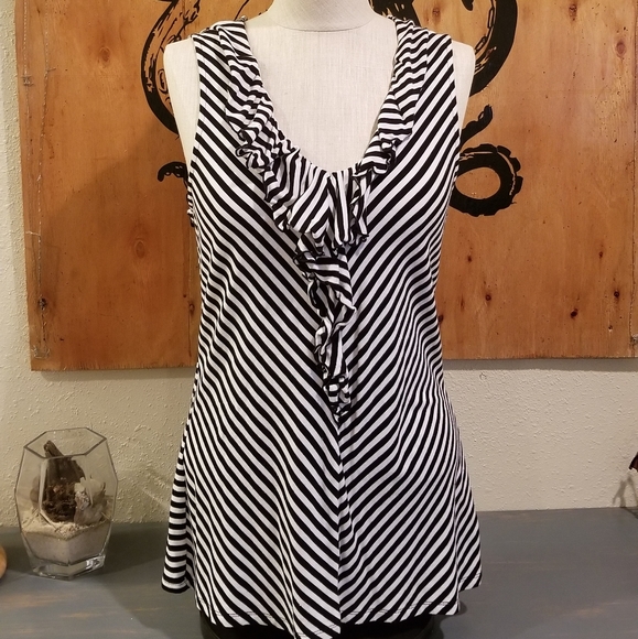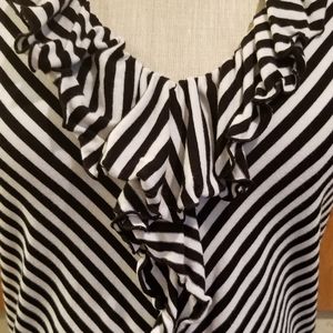 Black and white striped White House Black Market Top. No flaws. Stretchy material with fun ruffles on front.