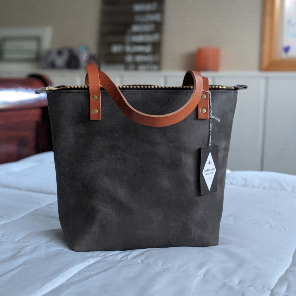 Brand new medium Portland Leather Goods Tote, medium size with a zipper top! This is a true grey color but I'm not getting any natural light to photograph it in so it looks more brown. Definitely grey though! Has saddle color straps. I have six of these bags and the medium size is my favorite, not too big and not too small! The very last picture is my personal collection of PLG bags, the second from the left is the grey color in this listing, I wanted to show a better color representation.
