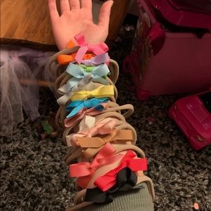 Got my little girl modeling for you. These are elastic & nylon. The bows are fabric and hold up good. These fit from 0-3 months. My girl is 7 months and they are a little cozy, (she has a big head though) :)