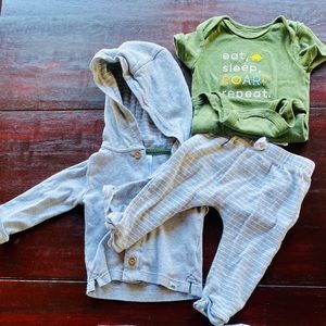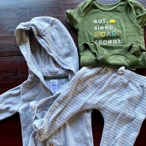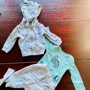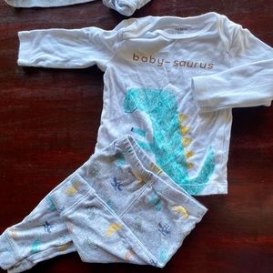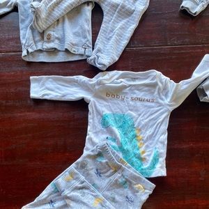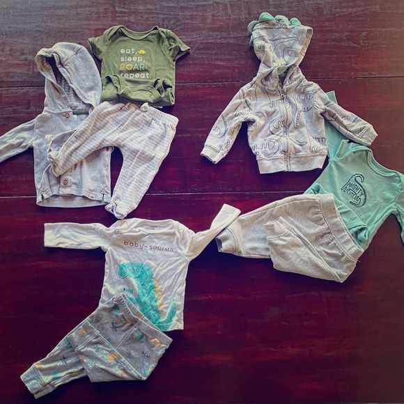 Dinosaur themed. 2 hoodies 2 onesie 1 long sleeve top and 3 bottoms. These are matching sets that came together. Clean no pet or smoking home‼️💙