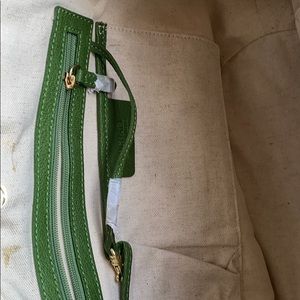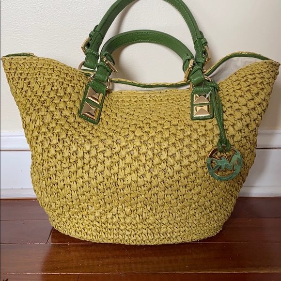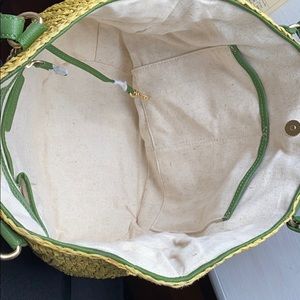 Never used Raffia tote bag with beautiful summer green leather handles no stains or pulls in straw.