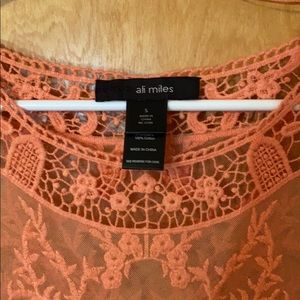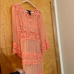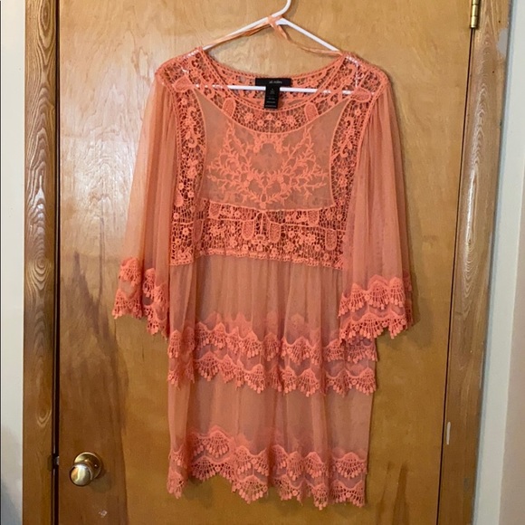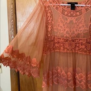 Size S. Coral lace tunic! Super cute only worn once. No rips or stains. Bell sleeve 3/4. Make me an offer