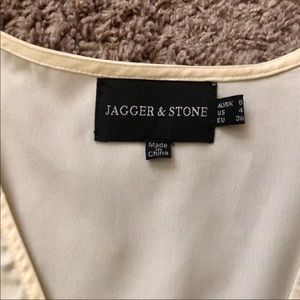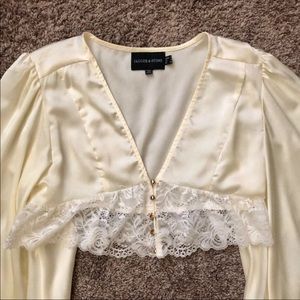 This blouse from Princess Polly comes new without tags. It’s of this off-white, silky fabric and has lace trim. If you have any questions or want measurements, feel free to ask. Sold out online.