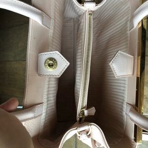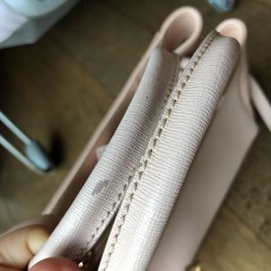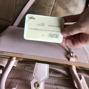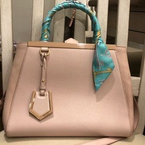 A super cute Fendi 2 Jours in petite size. The color is perfect for spring and summer. Please see the pics for the flaws. On the back there is a stain and the handle has peeled. I decorated by a Tiffany twilly to fix the problem. Please note the twilly is not included. It comes with dust bag, charm on the bag, strap, and the authentic card.
