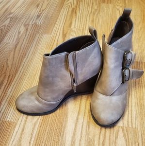 Altar'd State Ankle wedge Booties with 2 buckles on one side an the sipper on the other side. They are a tan/grayish color. Worn a few times. Comfortable shoes. Size 6.5(fits like a size 6)