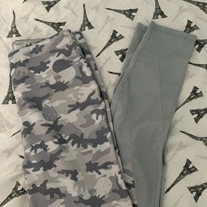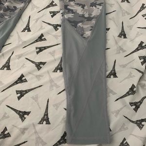 Grey leggings with see through bottom part of legs and the shirt is tied in front with half sleeves