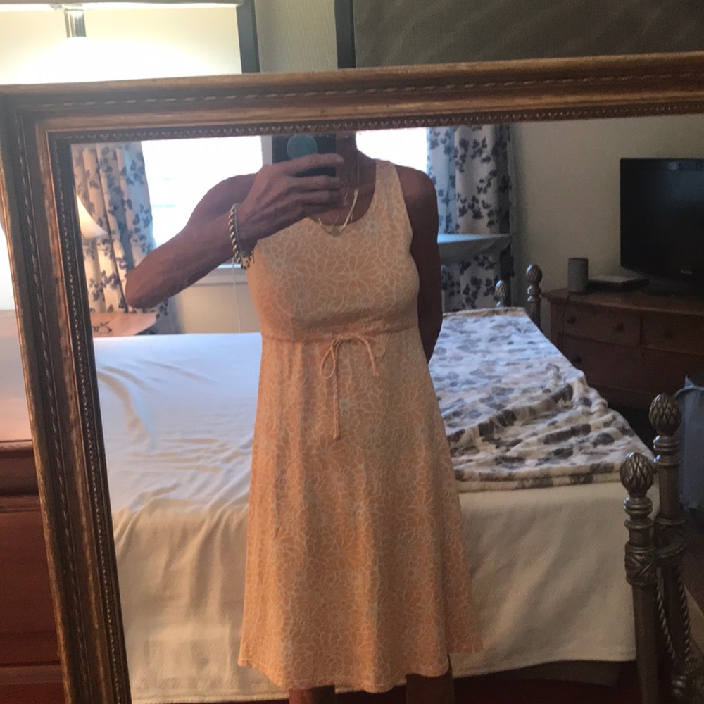The coloring is orange and white and it ties at the botice There is not a blemish on this dress add it to your wardrobe