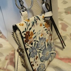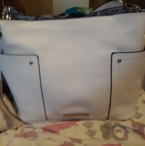 New white Steve madden purse comes with white cosmetic bag also has another side pocket. Has small floral coin bag and extra strap for longer wear.