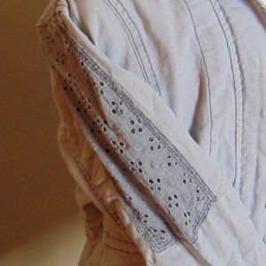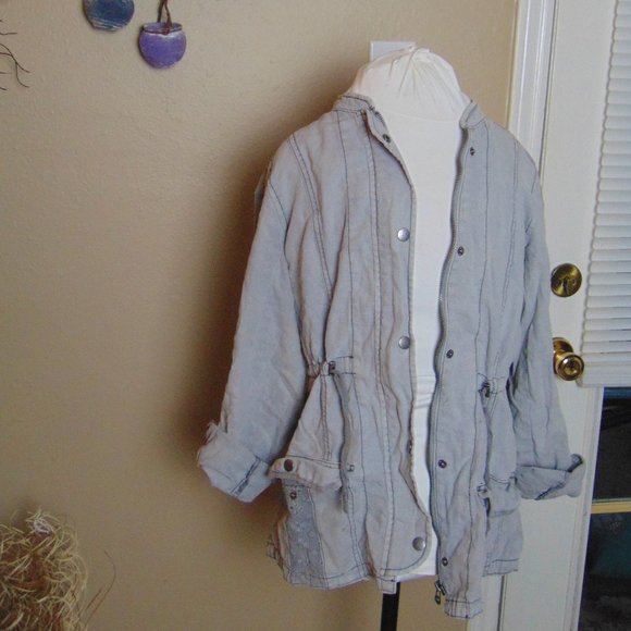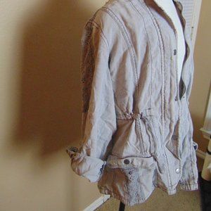 This cute jacket is perfect for all weather! It is a light gray color and has floral lace type accents on the arms and pockets. The pockets are large and can hold just about anything you need! Adorable on and very comfortable! Lightly worn and in great used condition.