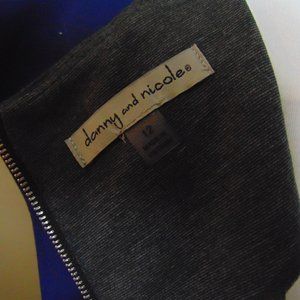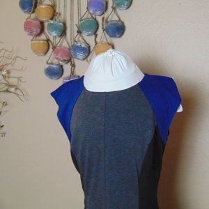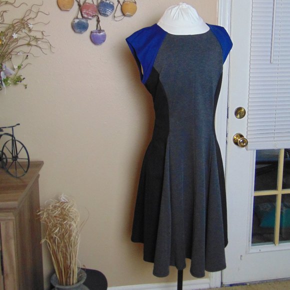This beautiful dress is great for work or any event! It has only been worn once and is in excellent condition. The front is gray with black sides making it very slimming. The pop of blue makes the dress extra special. Size 12 and the dress goes down to the knees.