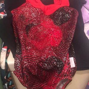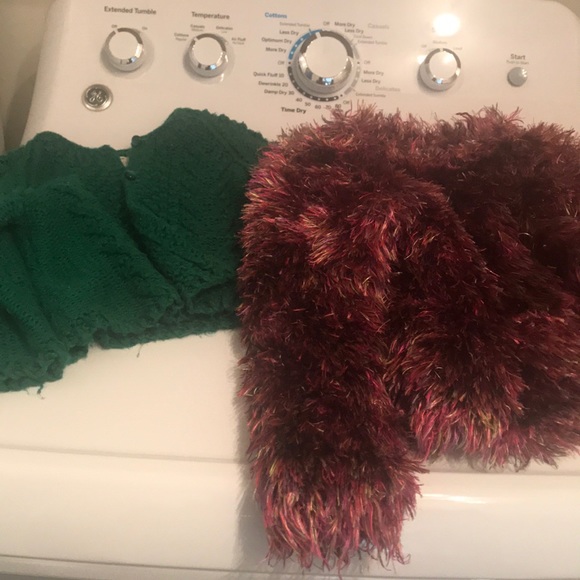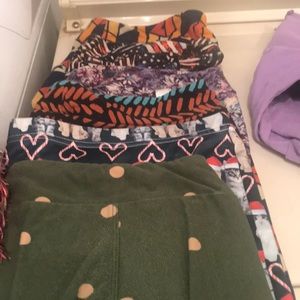 There is one green sweater button down front one furry pull over shirt, six tights, 2 shirts, 1 gymnastics and two pajama bottoms
