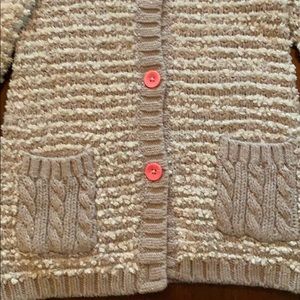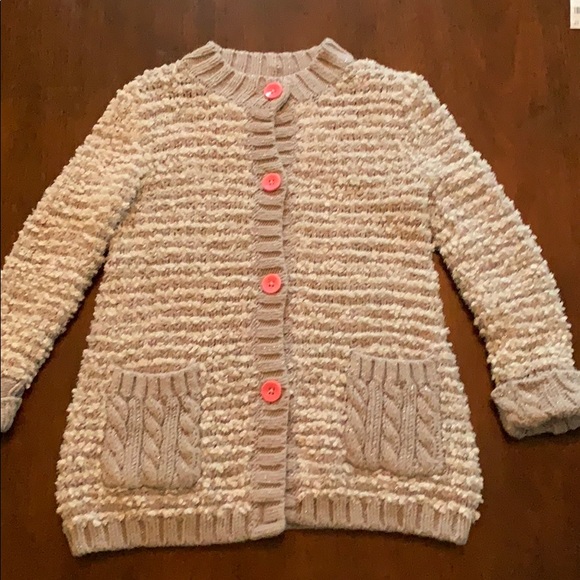 Grey knit button up sweater with pink buttons.