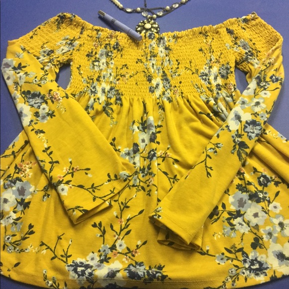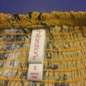 This is made by Xhilaration and is a size small. This is a yellow colored top with light blue and dark blue flower designs. The bell sleeves make it look flowy. Looks beautiful with a necklace.