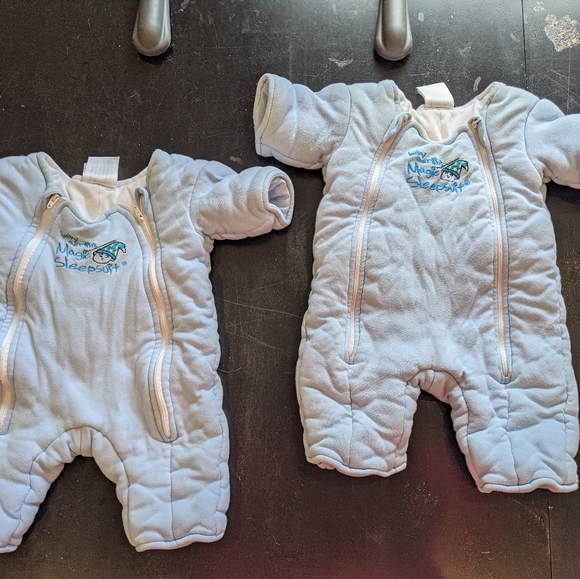 Two Magic Merlin Sleepsuits. If you know, you know. If you've heard, it's true! These really work and my baby liked them better than a swaddle. They are in great shape except for a small hole as shown. No stains and a TON of life left.