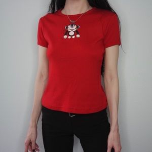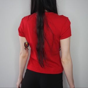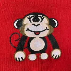 Baby Monkey Tee ๐ต๐ Size: Juniorโs Large by Self Esteem in the 2000โs! Deadstock with the cutest butterfly tag!! Cherry red baby tee with glittery baby monkey graphic!! This qt sparkles like no other, pix donโt even do it justice ๐ 100% cotton. Very soft n quite stretchy! Pit to pit 18โ flat Bust 33-38โ Waist up to 31-34โ