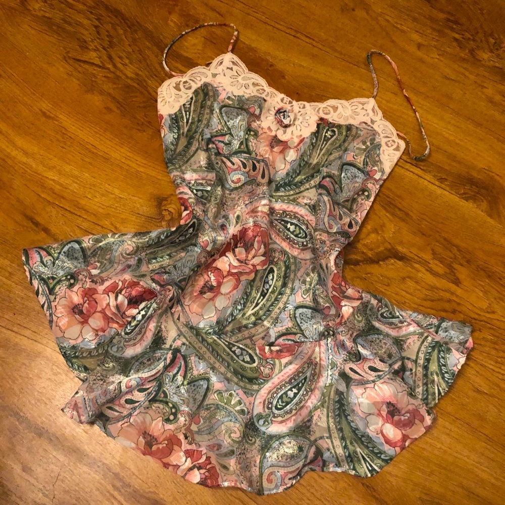 Vintage Floral embroidered Victoria secret slip. Fit & flare feels w beige lace lining at the top! In perfect condition 🌸🦋 doesn’t say a size but I’m a med/large (more large lol)and it fit me pretty well but the bust was kind of tight on me. So maybe a med?