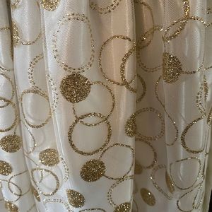 This dress is absolutely gorgeous!!! It was worn two times. Black velvety top with white and gold glitter bottom. Perfect for a special dance or party!