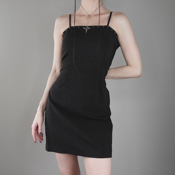 Size: Juniors Large (pinned on me) Fits like a Medium. Pit to pit 17-18” Bust 34-36” Waist 29-31” Hips 40-41” by Candy Rocket in the 1990’s! Vintage gothy glam black shimmery spaghetti strap mini dress with lil rhinestone gem detail along the bust, stretch bod and back zipper 4 EZ access! Swipe for a close up of the sparkly bod!! Hard to photograph but it will truly take your breath away when you see it IRL! Pair with fishnets and platforms 4 the ultimate fit!