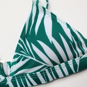 Brand new in original package with sanitary liner. Strappy cheeky bikini bottoms with triangle top. Adjustable straps. Removable padding. Very cute color and pattern, kelly green. Tag says medium. Top band is about 28” around.