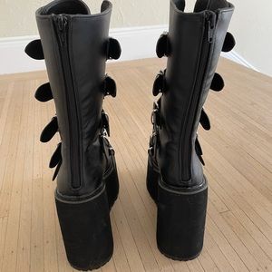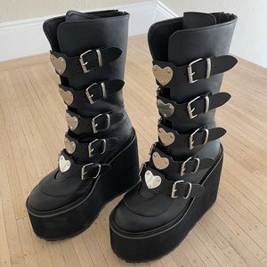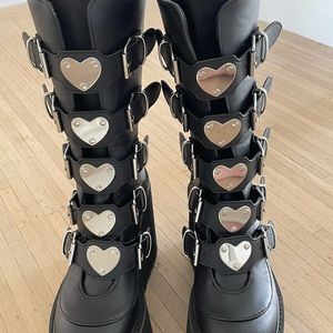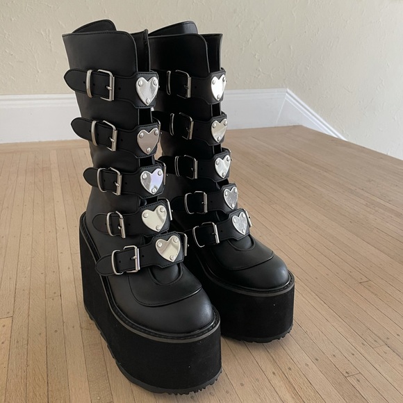 Description from website: 5 1/2" (140mm) Platform Mid-Calf Boot Featuring 5 Buckle Straps w/ Heart Shaped Metal Plates at Center, Back Metal Zip Closure