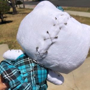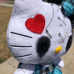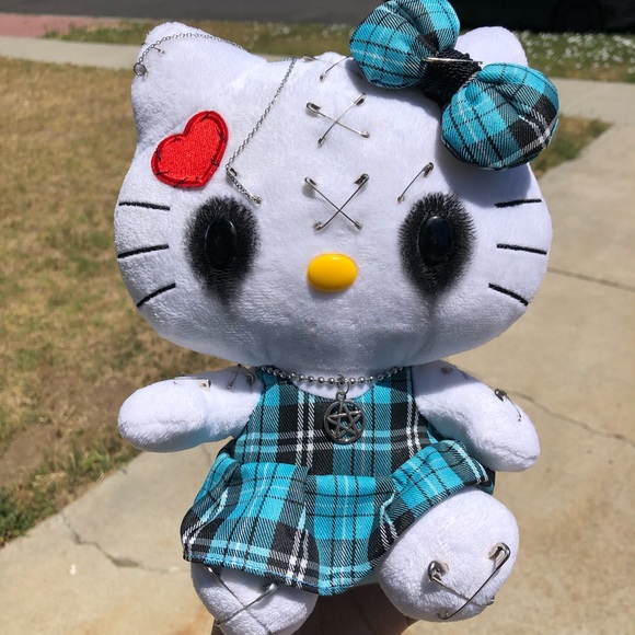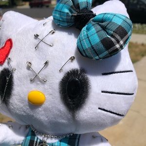 Custom goth hello kitty! About 9”. She is so beautiful and perfect. Looks so cute in the room. Take her home. She ready to be loved. She has a small pinkish mark near her eye shown in photos, but adds more character. If you’d like I can add a small red heart patch over it though, just lmk.