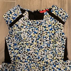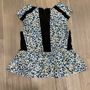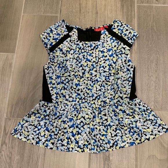Sleeveless floral print (bleu yellow black white) top with eye closure zipper in the back.