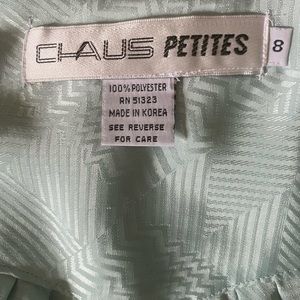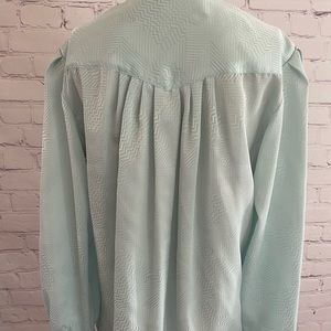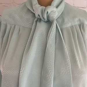 Vintage blouse with ties around the neck, buttons down front and at the wrist, silky material. Size 8 petite.