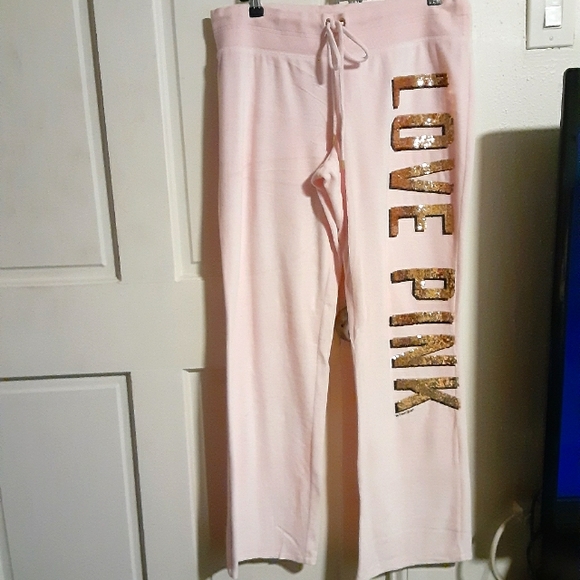 Victoria Secret- Pink- bling Velour pants in size large. These are brand new never worn. A very pale pink Velour pants with gold bling lettering down leg. Features back pockets. NWOT