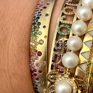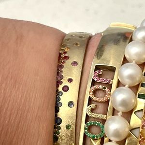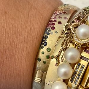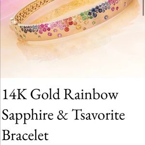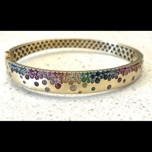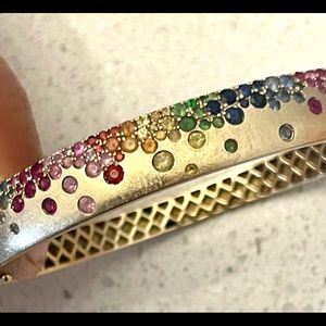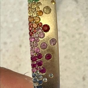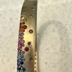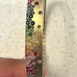 Rainbow Sapphire and Tsavorite 14K Brushed Yellow Gold Bangle Bracelet.
